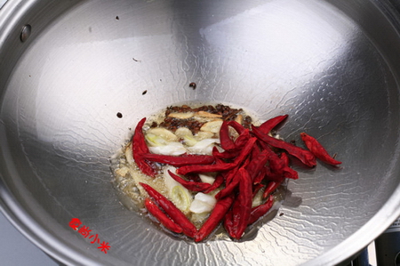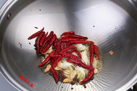 2、蔥姜蒜炸透,下入紅油辣醬、干辣椒,翻炒出香味燒至六七成熱時(shí),