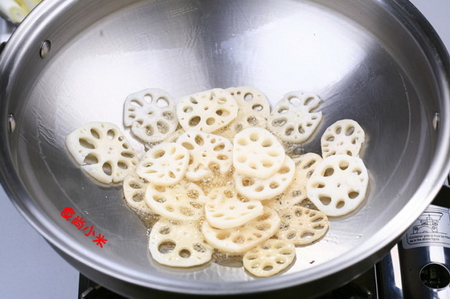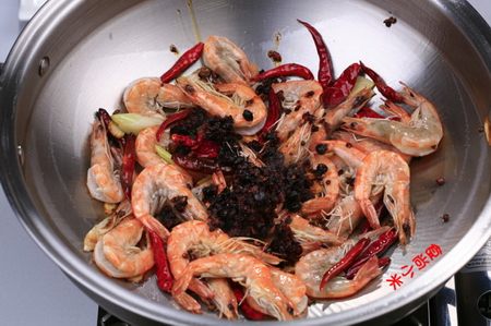 3、放入蝦,蓋蓋炸約1分鐘,煸至外焦里嫩