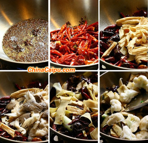 5、炒鍋燒熱,倒入比炒菜時(shí)略多的油,蔥姜爆香后,下花椒、大料爆出香味