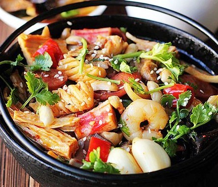 做法:1)木耳、腐竹事先用清水泡發(fā),木耳清洗干凈后去掉根蒂,撕成小塊、腐竹切小段2)其他各種蔬菜清洗干凈,該去皮的去皮,再改刀成塊狀或片狀3)準備各種肉類,然后五花肉切片、蔥姜切片、切絲備用,香腸切片,蟹柳切段4)準備各種調(diào)料,紅辣椒和干辣椒切碎、豆瓣醬剁碎5)燒開一鍋水,水中放一小勺鹽,分別將各種蔬菜入鍋焯熟,撈出后控干水分,將蝦仁和魷魚片也一起焯熟6)鍋中放兩勺油(和平時炒菜差不多就好),油燒熱后,將剁碎的豆瓣醬下鍋煸炒,炒出紅油7)放紅辣椒和干辣椒(辣椒的量隨自己喜好),放入五花肉炒熟8)加入蔥姜蒜、洋蔥、青椒片煸炒9)加入蟹柳、香腸和焯熟的魷魚卷和蝦仁煸炒10)最后放入焯熟的各種蔬菜11)隨個人口味加入半小勺鹽、1小勺糖、1小勺辣椒油和少許花椒粉12)最后撒入烤熟的花生和白芝麻13)撒些孜然和香菜即可出鍋