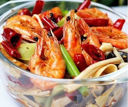 食材:300g海蝦、100g五花肉、100g萵苣、100g藕、100g金針菇、100g豆皮、100g芹菜、適量油、適量鹽、100g紅干辣椒、適量花椒、適量香葉、適量桂皮、適量八角、適量茴香、10g白糖、5ml香油、適量香菇