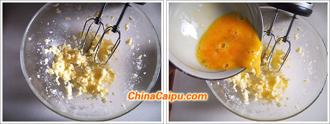 2、全蛋打勻后,分次加入到黃油混合物中,每一次攪打均勻后再加入下一次。