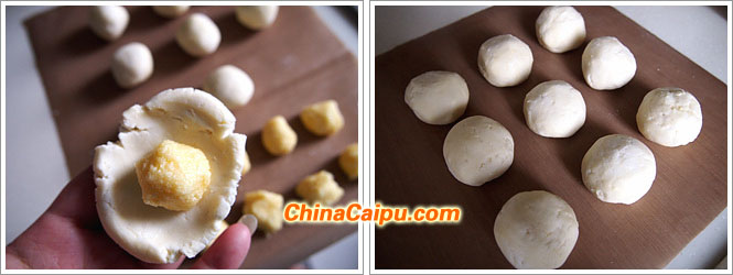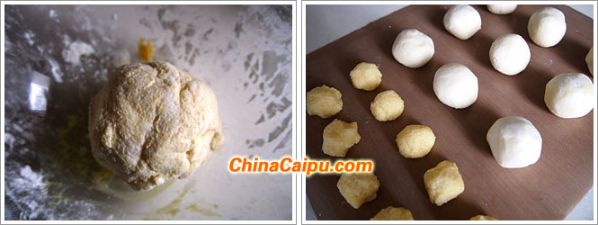 8、把揉好的面團(tuán)分成小份,每份25g左右。椰蓉餡團(tuán)成小球,每個(gè)約6克左右。