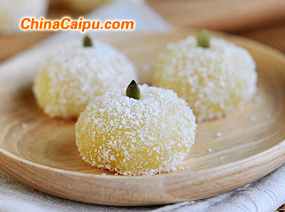 13、出鍋后,趁熱立刻裹上椰蓉,涼了不容易裹上了。