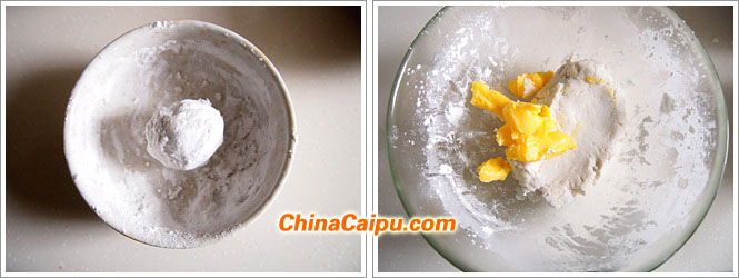 糖水加入到糯米粉中攪拌均勻。加入澄面團(tuán)攪拌均勻后,放入酥油攪拌均勻。