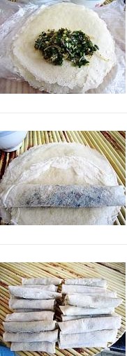 8. 輕輕卷起,封口用面糊粘緊,成為春卷生坯。
