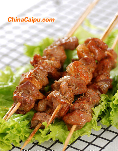 羊肉中,加生抽3湯匙,孜然粉1茶匙,油1湯匙,鹽1茶匙腌制半天,過夜也可。(肉不可太瘦。肥瘦相間烤出來才好吃。)
