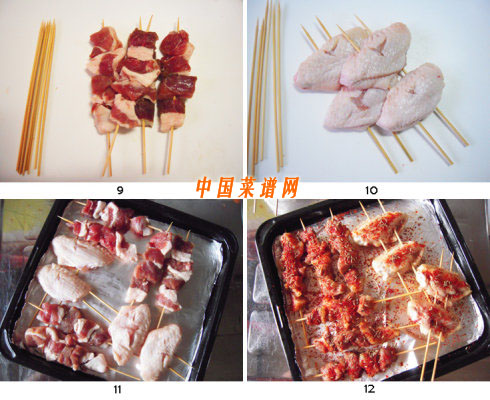 10.在每?jī)筛窈炞由戏謩e穿上兩個(gè)雞翅中。