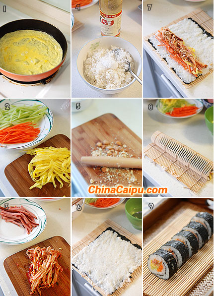 4、取竹簾,放上一片烤紫菜,再放上米飯,用沾水的大勺子,或者直接用沾水的手將米飯均勻地壓實在紫菜上,只在不靠近自己的那一頭留1cm的邊沾合用(準備工作時,要弄一碗涼白開或礦泉水,用來沾手或勺子用,這樣,米飯就不會沾手啦?。?br data-cPLQ="2Jf1dB">5、在靠自己的這一頭,鋪上黃瓜、胡蘿卜、韓式泡菜、雞蛋、火腿條,撒上杏仁碎。