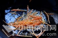 4.鍋里倒油燒至7成熱下入胡蘿卜絲翻炒熟撈出,剩下的油滑炒