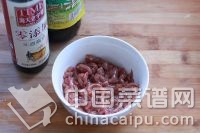 2.牛里脊切絲,加入適量的醬油、鹽、料酒抓板均勻,再倒1勺油,腌制20分鐘。