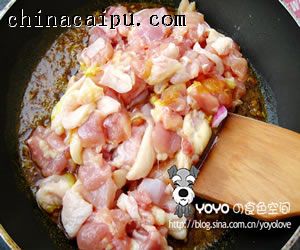 4、加入雞腿肉、白糖,翻炒2分鐘;