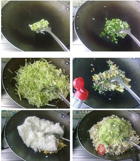 2、飯菜切絲,蔥切小段。