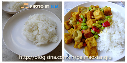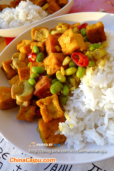 米飯,加入做好的豆腐,豆腐
