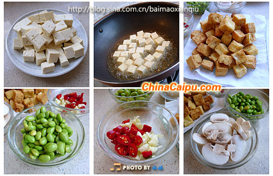 2、 北豆腐過水切成3cm左右的小塊,放入加了鹽的油鍋中輕炸至金黃,撈出瀝油待用;