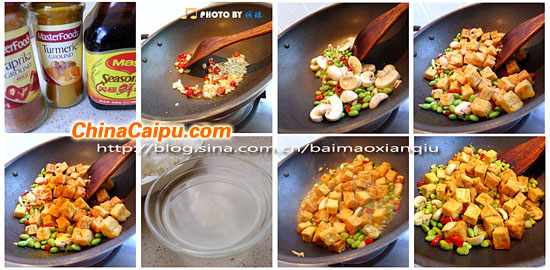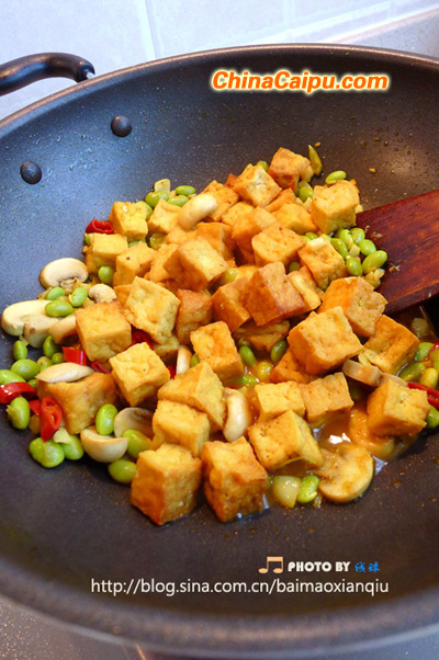 蘑菇變軟,毛豆至熟,放入炸好的豆腐塊,淋入高湯,撒上姜黃粉和紅椒粉,滴上些美極鮮醬油,中