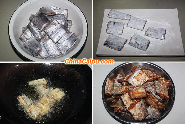 9、將帶魚(yú)段沾上干淀粉,然后抖掉浮著的干淀粉放入五成熱的油鍋中中小火炸成金黃色肉質(zhì)干香;因?yàn)楸砻嬗秀y色的鱗和淀粉,所以炸好的帶魚(yú)表面顏色也不深,要看著帶魚(yú)斷面的顏色,別炸糊了;