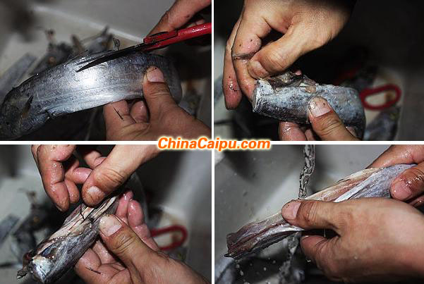 5、帶魚(yú)也可以提前做,將帶魚(yú)剪去邊上的魚(yú)鰭,然后剪去