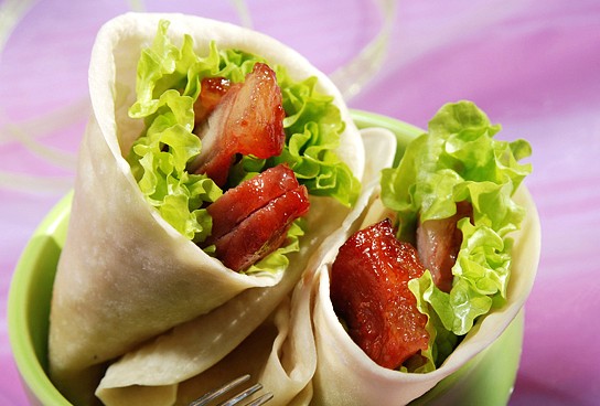 做法:春餅上鋪生菜,放切片的叉燒肉,卷起即成。