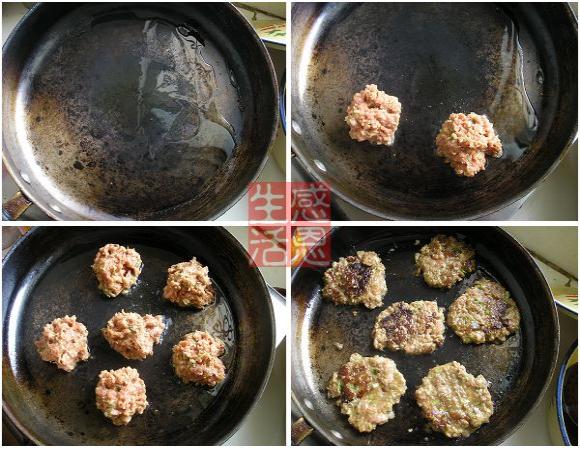 平底鍋放油,燒至溫?zé)帷?br data-XHo3="RJJAOo">6.將攪拌好的肉餡團(tuán)成團(tuán)放入鍋內(nèi)。