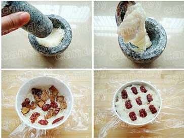 2. 紅棗清洗干凈,浸泡半小時(shí)后,放入煮鍋中,煮15-30分鐘,取出后去核,備用.(或者直接用去核紅棗)