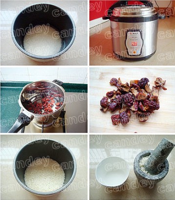 米飯的水量稍微少一些)和適量冰糖,浸泡四小時(shí)后,選擇"煮飯"鍵煮熟.(有預(yù)約功能的電壓鍋可以定時(shí)4小時(shí))