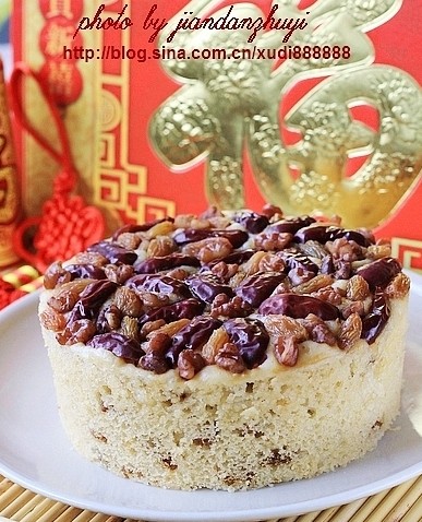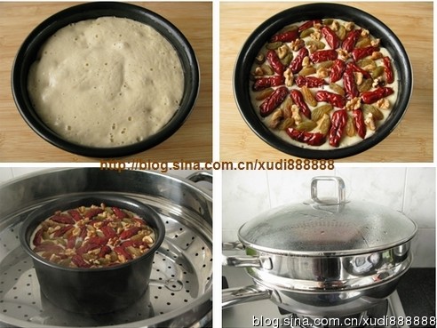 6 表面擺上去核紅棗及其余部分的葡萄干和核桃仁,冷水上鍋,大