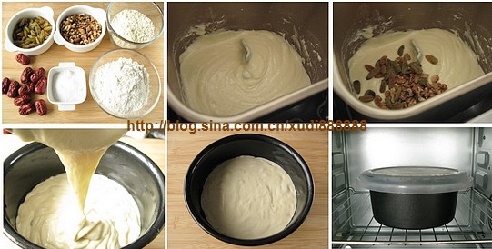 3 加水混合攪拌成稍具流動性的面糊,加入大部分分量的葡萄干和核桃仁拌勻;