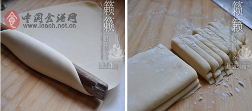 2.將面團(tuán)再次搓揉均勻,案板撒上手粉,用面杖將面團(tuán)搟成均勻厚度的大面片(面片厚薄依據(jù)個人喜愛的口感而定);面片撒上手粉后折疊,刀切成條絲狀,切好的面條撒上手粉抖散。