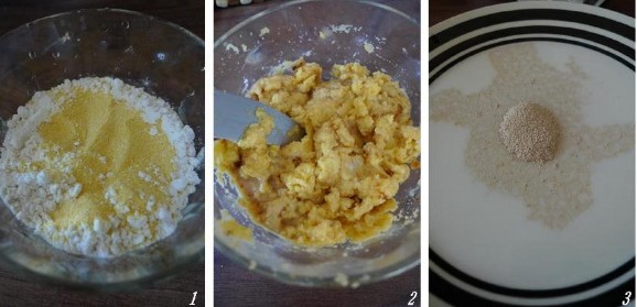 1. 黃米面和自發(fā)粉以2:1的比例混合,加入糖,充分混合拌勻。