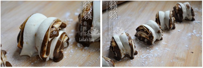 4-5.將筷子按壓出痕的劑子兩頭捏合即成花卷生胚,依次兩塊劑子一組將所有花卷生胚制成;花卷生胚排入刷油的