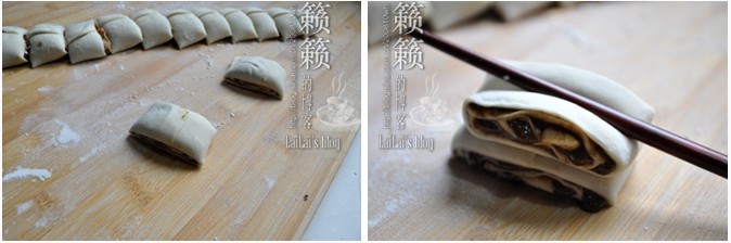 3-4.將圓面片卷成圓筒形狀,刀切成均勻大小的小劑;取兩塊小劑將其疊加,包卷時的收口處相對,用一只筷子豎向逢中按壓;