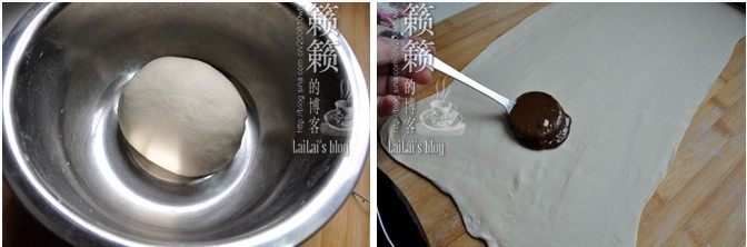 1-2.將酵母在溫水中化開,靜置3、5分鐘;徐徐倒入面粉盆中,邊倒邊用筷子將面粉攪拌成雪花片狀,再搓揉成光滑面團;案臺上撒上手粉,將面團用搟面仗搟成長方形面片,芝麻醬加入糖、鹽混合均勻,涂抹在面片上;