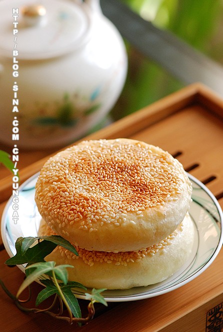 11、取平鍋,在鍋底刷上一層薄油,微火,將餅坯放入(芝麻面朝下),蓋上蓋,待餅完全發(fā)起,芝麻面發(fā)黃后,翻面,蓋上蓋再燜烤至此面發(fā)黃即成。