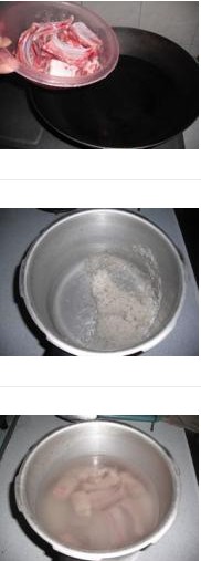4. 排骨洗凈,放到煮開的水了焯一下,瀝干撈出。