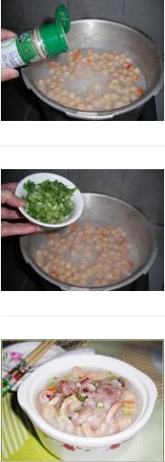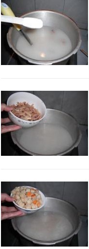11. 開火,把粥煮開,然后把爆香過的魷魚放進去煮。(不可煮太久,以免魷魚煮老了變硬,影響口感)