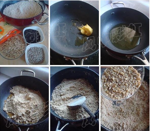 6、炒約30分鐘,面粉的顏色已經(jīng)變黃,而且會聞到熟面的香氣