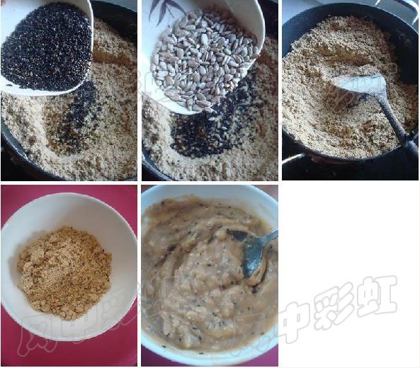 13、吃的時候,取幾勺油炒面放入碗中,根據(jù)口味,加入糖或鹽,再倒入沸水攪拌成糊狀即可。還可以在上面點綴一些