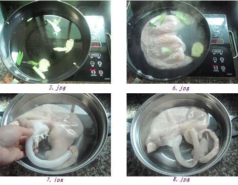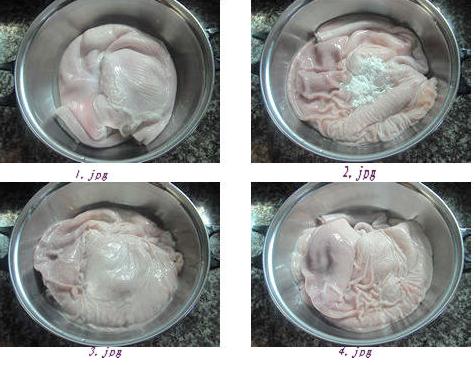 4:然后清洗干凈,如此反復(fù)清洗三遍,直到豬肚上十分的清爽,無粘液為止。