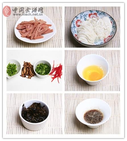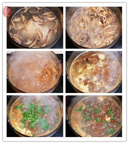 7、鍋置火上,倒入高湯,沒有高湯就用清水代替,燒開后先放入豆腐略煮一下,然后放入香菇絲,火腿絲,木耳絲,