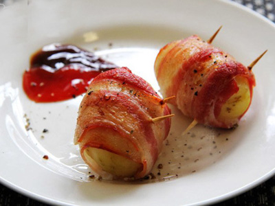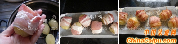 2.撈出瀝水,涼至不燙手后剝?nèi)ネ馄溆?br data-LIWE="U8EBoX">3.培根裁到適合土豆的寬度,卷在土豆上面