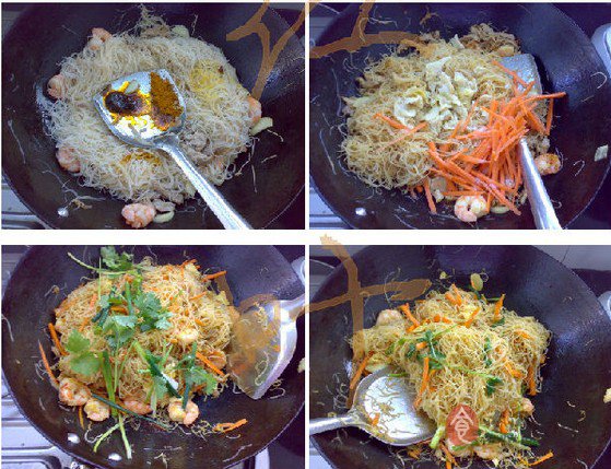 7 等到米粉的兩面均煎至有點(diǎn)焦,下調(diào)味料