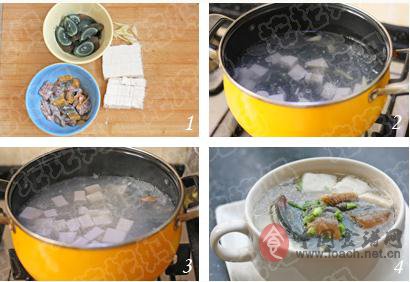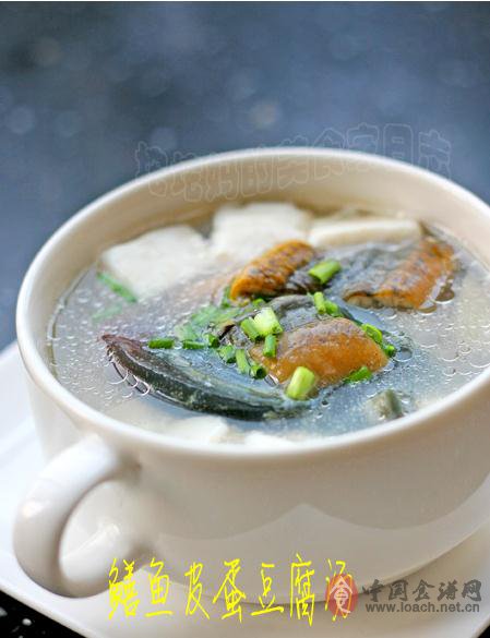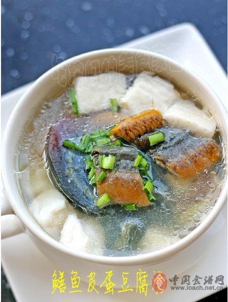 1.皮蛋兩個切瓣,大鱔魚兩條去骨去腸洗凈,改刀成片,加少量鹽、料酒、生粉、蛋清拌勻,內(nèi)脂豆腐半盒切成小塊,生