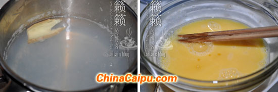 3-4.鍋內(nèi)煮蛤的水撇去上層浮沫,瀝出中段水,攤涼備用(鍋中底層水中會有少許雜質沉淀,棄之不用);雞蛋去殼打散,將溫蛤水徐徐倒入打散的蛋液中(蛋液與溫水比例約為1:1,蒸出來的蛋塊帶有點小彈牙,如果喜歡更水嫩口感,可以加大溫水的比重),調入少許糖、鹽,攪打均勻;