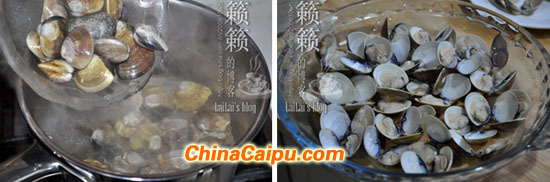 1-2.鍋內(nèi)坐水,加入拍碎姜塊大火煮開,將前期處理好的文蛤放入鍋中,煮至蛤殼一開口即快速撈出,逐一擺放在耐高溫的蒸盤中備用;