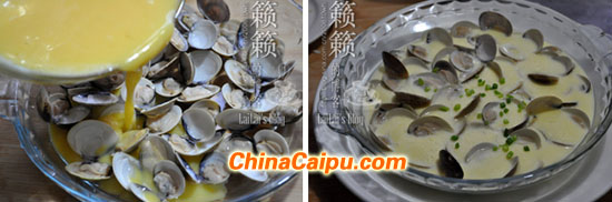 5-6.將混合蛋液倒入蒸盤中;鍋內(nèi)坐水煮開放入蒸盤,待蛋液邊緣見白時轉小火加蓋蒸制;蛋液蒸熟后(約8分鐘,可用竹簽插試把握生熟度),將蒸缽取出,撒上蔥末,點上少許