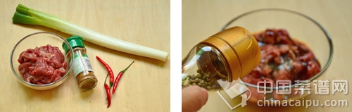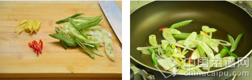 辣椒切碎,大蔥斜切成條;依次將姜、辣椒、大蔥放油鍋爆香