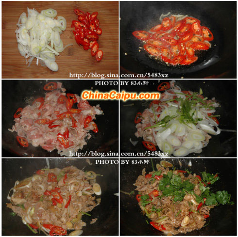 2.熱鍋上油,油熱后下姜絲爆鍋,倒入紅椒炒香。