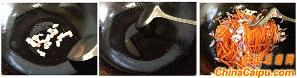 2、起鍋?zhàn)?,先放牛肉的肥肉部分,小火熬出牛油后,油渣撈出不要,下胡蘿卜和洋蔥翻炒。