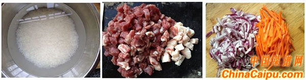 1、大米洗凈浸泡約1小時(shí),牛肉切粒,